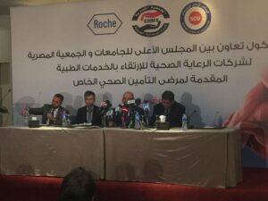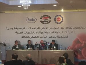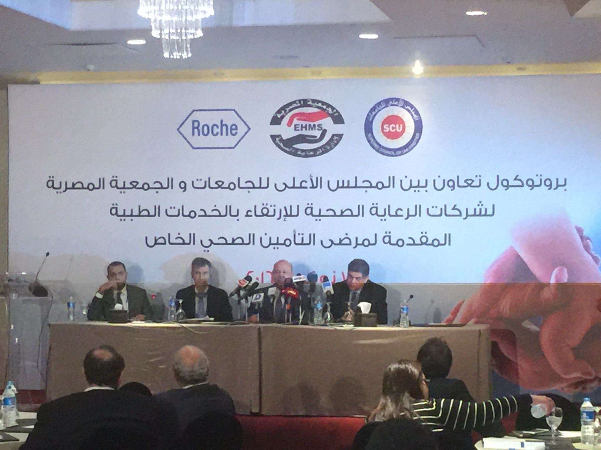 A press conference for the cooperation protocol between the Supreme Council of Universities and the Egyptian Association of Healthcare Companies to enhance medical services provided to private health insurance patients, under the sponsorship of Roche